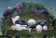 Within a framing bower formed of decalcomania blobs, dendritic lines meander from the biomorphic forms.