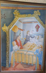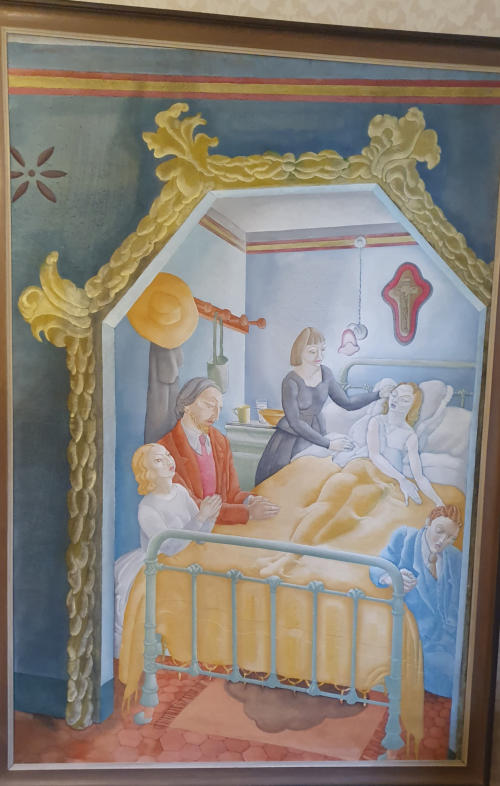 Oil on canvas. 77 x 51½in. (195.6 x 130.8cm.)Signed and dated.ProvenanceSotheby’s, studio sale, 24 April 1985, lot 547, ill. b/w. ExhibitedLondon, New Burlington Galleries, 1932, no. 52. London, Whitechapel Art Gallery, 1935, no. 16. Cheltenham, Municipal Art Gallery, 1936, no. 1.London, Parkin Gallery, 1977, no. 7.At the time that Colquhoun painted this picture, the Catholic Church’s official account of how Mary died and ascended to Heaven had not been agreed. It was not until 1950 that the doctrine of the Dormition was accepted as dogma: Mary was assumed into heaven in her body, not as a fleshless spirit. In some traditions, Mary died in her house at Ephesus, lying on her couch in the sleeping alcove. She was with her maidservant, a younger woman, who raised her periodically to drink juice. Peter, along with other apostles and angels, was also present. Standing at just over six feet tall, this is an imposing work. The virgin, depicted as an ageless woman, reclines in bed surrounded by people in modern dress and, who, by their gestures, appear curiously unmoved. One, a bearded man, loafs on the floor at the foot of the bed. The alcove is barely deep enough to contain the bed. It gives the events a distinctly theatrical atmosphere whilst retaining a sense of intimacy.There are few clues within the painting to indicate its true subject matter. It could be a lying in, rather than a prelude to a laying out. The artist, Ethel Walker, who was friendly with Colquhoun, referred to it as ‘Death (or is it Birth?) of the Virgin’Walker wrote to Colquhoun of her admiration for Death of the Virgin and Aaron Meeting Moses in the Desert (1932). She asked Colquhoun to make her a pencil and watercolour version of each work and sent her a cheque for £5 in advance. It is not known whether Colquhoun accepted the commission.Two preliminary pencil sketches and a water-colour study are known.