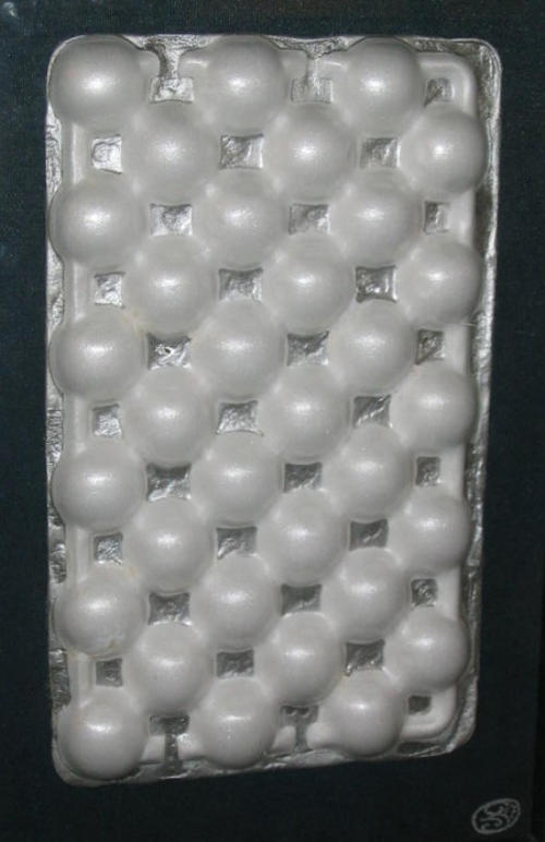 Silver painted polystyrene fruit tray mounted on hardboard and in a box frame.
