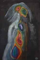 Oil on plaster board. 42 x 28½in. (108 x 73cm.)Signed with an early variant of the monogram and dated lower right.ProvenanceLay’s, Penzance, 2 June 1994, lot 405.Lays, Penzance, 14 Oct. 2003, lot 518. Lays, Penzance, 10 Feb. 2004, lot 19.Private collection.ExhibitedPenzance, Newlyn Gallery, 1967, (Autumn), no. 74. Berlin, Kunstamt Wilmersdorf, 1969, no. 13, ill. b/w. Bristol, The Arts Centre, 1970, no. 9.Exeter, City Art Gallery, 1972, no. 21.The support is builder’s plaster board, covered with emulsioned anaglypta wallpaper on the reverse side. It looks like Couquhoun was having her bath-room renovated in 1964 and claimed a piece of old wall. This may be the source of the watery associations. On the other hand, the title may have been inspired by the traditional antipathy between oil and water or the visual appearance of prismatic reflections.The roughly concentric circles on the body of this spirit figure are reminiscent of those found in Autumnal Equinox (ca. 1949) and other works. They may be related to the chakras, the power centres of the body, although their distribution is not orthodox.