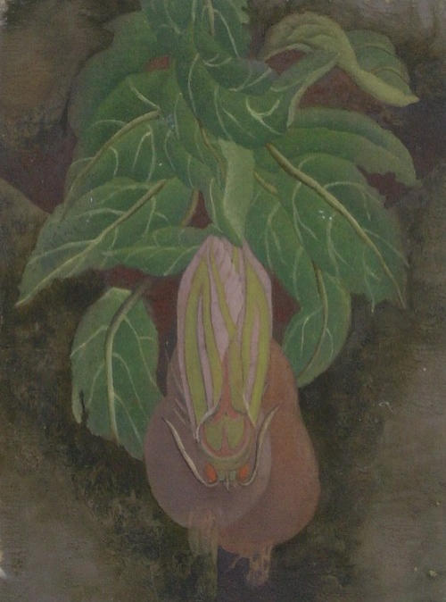 Stand close to the painting and the pitcher plant with a flanking pair of corms is clearly visible. Step