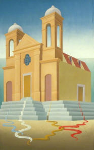 Oil on board. 36 x 24in. (91.1 x 61.2cm.)Signed, inscribed and dated verso.ProvenanceSouthampton Art Gallery from the Parkin Gallery, 1979. ExhibitedLondon, Mayor Gallery, 1939, no. 6. Northampton, Art Gallery, 1939.Harrogate, Art Gallery, 1941, no. 20.Penzance, Newlyn Gallery, 1961, no. 13. London, Hamet Gallery, 1971, no. 31. London, Leva Gallery, 1974, no. 12.Penzance, Newlyn Gallery, 1976, no. 4. London, Parkin Gallery, 1977, no. 19.Touring, Scottish Arts Council, 1985, ill. b/wLeeds, City Art Gallery, 1986, no. 184, ill. b/w p. 184.Berkeley, California, University Art Museum, 1990, ill. col.LiteratureStich, 1990.Remy, 1999, p. 204. Caws, 2004, ill. col. p. 26. Robinson, 2005, pp. 282-283, ill. col. Ratcliffe, 2007, ill. b/w pl. 36.One of the Méditerranée series. The title is generally translated as ‘Tepid Waters’. It comes from the poem Summer Sadness by Stephane Mallarmé. The poem records the poets’ sadness at the end of an affair.Mais ta chevelure est une rivière tiède Où noyer sans frissons l’âme qui nous obsèdeA literal translation might be: But your hair’s a tepid river, A place to drown the soul that haunts us Colquhoun published her own translation in 1947. In her version the relevant lines are:Yet in your warm hair golden, downward-flowing,I find Nirvana and leave you unknowingAn austere building, with two bell towers, stands in isolation on a stepped platform in an anonymous location. It is devoid of life or activity, except for four rivulets of coloured fluid. Each one seeps out from beneath a closed door, runs down the steps and mingles on the forecourt. The horizon is set at the golden section of the height of the painting. The architectural features of the façade have not been laid out with geometrical precision and project to different vanishing points. It is unlikely that this reflects a lack of concern with precise draftsmanship. It is more likely to be the deliberate introduction of subtle distortions akin to those that de Chirico used in his paintings of deserted Italian city squares. It associates disquiet with urban environments.Stich correctly identifies the building as a church. She comments that, although the building itself stands erect, it no longer represents a sanctuary of hope and faith. She sees the image, in part, as a reflection of the Surrealist antagonism towards the church but also suggests that it alludes to the church’s questionable association with fascist repression, especially in Spain during the civil war. The Leeds catalogue entry also makes the fascist association, alleging that the rivulets are in the colours of the Spanish flag. These proposals are in keeping with the one that was discussed earlier in relation to Marlowe's Faust (1931), that it contains a commentary on the rise of the national socialists in Germany.Remy comments upon the tension that can exist between the interior and exterior of an object - in this case the church. A secret is clearly lurking inside the closed building but we are barred from knowing it directly. Only the seeping rivulets, which suggest blood and body fluids, offer a clue to the nature of the secret. Robinson suggests that the isolated building is a metaphor for the 'hut of reeds' a sanctuary for women to make contact with 'the night side’ of their own nature. The allusion is to menstruation and the quotation is from Divination, a short prose text published in Osmazone some years later in 1983 and not written until 1949. It is certainly possible that Colquhoun had the political situation in Spain in mind, although the colours of the rivulets: white, red, blue and yellow, cannot be used as supporting evidence. The Spanish flag is bi-coloured: red and yellow. It has no white or blue. Further, there is no independent evidence that that she took any interest in the political struggles in Spain, although many of the continental surrealists did. Toni del Renzio, who fought in Spain, might provide a link, but Colquhoun and he did not meet until months after the painting had been finished. The other possibility is Francesc d’Assís Galí, the Spanish artist and exile who arrived in London sometime during 1939, but their relationship does not appear to have started before 1940.. It is surely more likely that, because all the colours have clearly under-stood hermetic meanings, the work reflects her life-long interest in alchemy and the gendered cosmos. This proposal explains the colours and does not require an otherwise unrecorded interest in Spanish politics.Alchemically, red, the colour of elemental fire, represents the male principle. Here it is paired with yellow, the standard alchemical colour for philosophic sulphur. Similarly, blue, the colour of elemental water, signifies the female principle and is paired here with white, the colour of philosophic mercury, the female principle of the alchemists.Philosophic mercury and philo-sophic sulphur are to be under-stood as spiritual substances rather than physical ones. They represent the gendered metals which have been purified and which have to be united in order to create the philosopher’s stone.The two rivulets that represent the hermetic and alchemic female principle meet after they descend the steps, as do the rivulets that represent the male principle. The male and female philosophic prin-ciples then come together in the foreground. This is the secret of which Remy is half aware: the Great Work, spiritual perfection, conjunctio. Perhaps Colquhoun was also making an oblique reference to the Tridentine Mass, which contains the phrase: Vidi aquam egredientem de temple. This translates as: I saw water coming from the Temple and was later used as the epigraph to her novelI Saw Water.The origin of the rivulets in a church indicates that the source of all matter is spiritual and all matter has a spiritual content.Regarding the actual building, it is the Église de la Miséricorde, (also known as the Église du Couvent because it adjoins a f