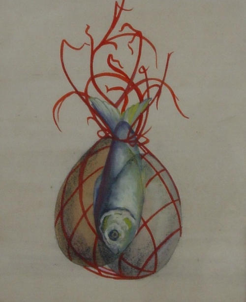 Watercolour. 8¾ x 6¾in. (22.3 x 17.3cm.) (ss)ProvenanceNT.ExhibitedLondon, The Leicester Galleries, 1941, no. 33. This painting, portraying the male genitalia as still life, is a male equivalent of Tree Anatomy (1942). The effect, however, is very different. Here, the penis is depicted as a small fish, trussed up in a net-like string bag that also serves as scrotum, containing the two eggs/testicles. The objects hang, like sporting trophies. What a wonderful heraldic device they would make! However, it is more than just a visual pun: alchemically, it fuses the male with the female. Testicles are uniquely male and eggs are uniquely female. Colquhoun has united the genders in a single form. Part metaphor, part double-image, part sadistic revenge on the male surrealists’ enthusiasm for dismembering the female body, is there anything less potent than a dead sardine?
