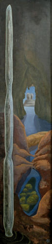 The dramatically elongated shape of this painting echoes the tall, thin form of the