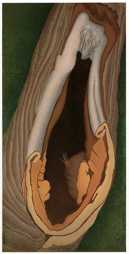 Oil on panel.22¼x 11¼in. (56.9 x 29cm.) Signed, titled and dated verso.ProvenanceSotheby’s, studio sale, 24 April 1985, lot 521. Pruskin Gallery, London.Private collection, Leeds. ExhibitedLondon, The Leicester Galleries, 1942, no. 42.Penzance, Newlyn Gallery, 1961, no. 29.Exeter, City Art Gallery, 1972, no. 4.Penzance, Newlyn Gallery, 1976, no. 10. London, Parkin Gallery, 1977, no. 23.London, Blond Fine Art, 1985, no. 40.Canterbury, The Herbert Read Gallery, 1986, no. 79, ill. col. (photo inverted).Finland, Retretti Art Centre, 1987.Wolfsburg, Kunstmuseum, 2002-03.Middlesbrough, Institute of Modern Art, 2008, ill. col. p. 50.Leeds, City Art Gallery, 2009, ill. col. p. 139.Manchester, City Art Gallery, 2009, no. 34, ill. col. p. 119.Damage to a tree trunk has left a canker; an area of decay that forms a gaping oval cavity. In a classic double image, knot hole becomes vagina. Although, physically, the painting is quite small, the image dominates the picture space. Gazing at that part of a woman’s body of which men are most afraid, the viewer is jolted by this subversion of scale and is transformed into a tiny creature experiencing the over life-size image as cavernous and engulfing.Tree Anatomy can be related to myths concerning vegetation deities, dealt with in The Golden Bough, the classic work of anthropology by James Frazer. Colquhoun’s own copy (sadly, un-annotated) is in the Tate Archive. We are reminded of the accounts in the book of men who attempted to fertilize trees in the way that came naturally to them, using an appropriate cavity in the bark. This image would certainly provide guidance for any inex-perienced rustic. We are also reminded of the myth of Daphne, who was metamorphosed into a laurel bush by her father, a river god, in order to preserve her from the sexual predations of Apollo. What a bitter irony if the only part of her to remain accessible was that which he most desired to protect! And, what a dereliction of paternal duty to leave his daughter so exposed and defence-less at her time of greatest need!When Colquhoun was asked to remove The Pine Family from the Leicester Galleries exhibition in 1942 because of its pornographic content, this was the work that she hung in its stead. A drawing by Edith Rimmington, used as the cover of the single-issue Surrealist publication Fulcrum in 1944, shows a tree trunk with bark and knot holes that take the forms of breasts and gaping vagina (not to mention the presence of a pair of scaly bird’s legs and talons that reach menacingly towards the vagina). Colquhoun experimented in automatic writing and drawing with Edith Rimmington and Emmy Bridgewater. Some of the latter pair’s joint texts were published in Fulcrum. Was Rimmington familiar with Tree Anatomy?The panel is from an old piece of furniture. The cartoon and a colour note are both known.